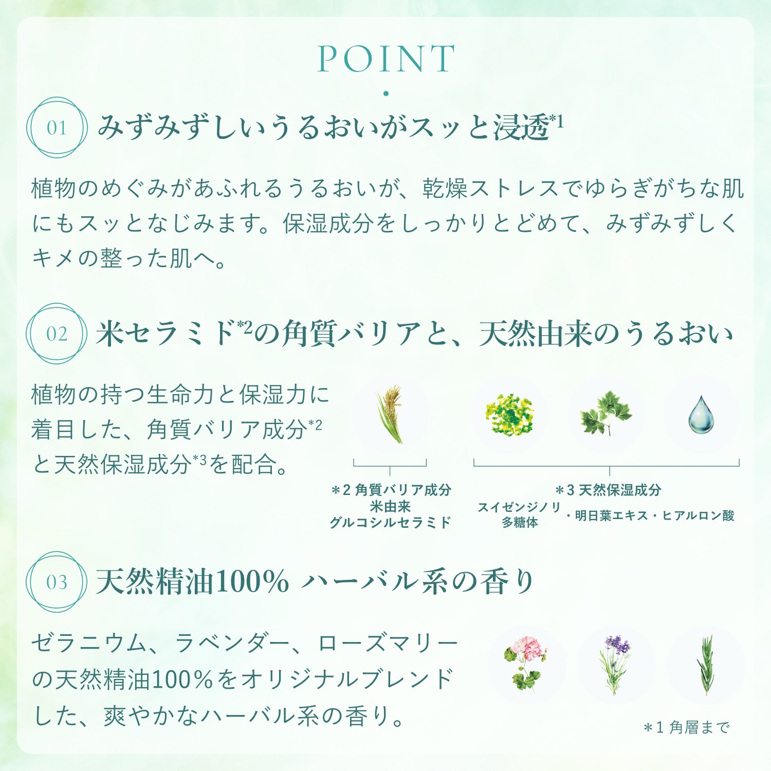 植物のめぐみがあふれる、みずみずしいうるおいが、乾燥ストレスでゆらぎがちな肌にもスッとなじみます。