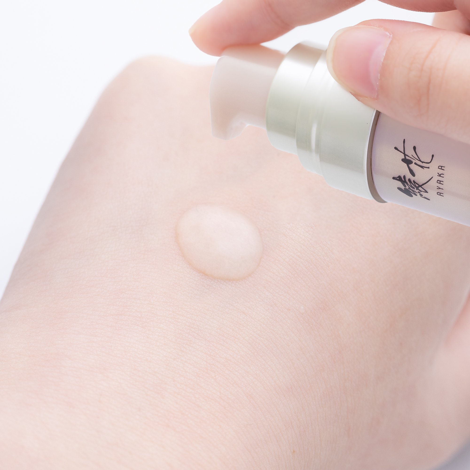- 化粧水のあと、適量(ポンプ1~2回)を手にとり、やさしく顔全体にのばします。そのあと、手のひらで顔をつつみ込むようにしてしっかりとなじませます。