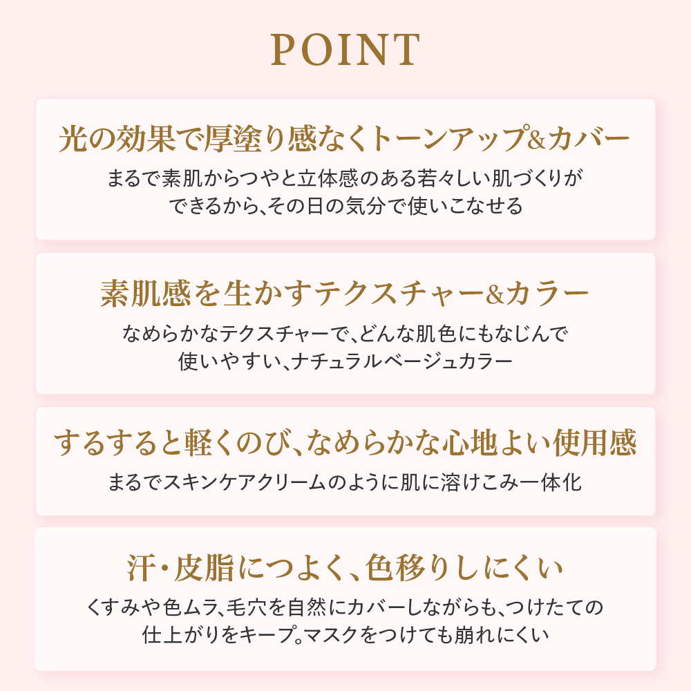 - 【汗・皮脂につよく、色移りしにくい処方設計】化粧もちアップ成分*4配合。汗・皮脂・につよく、マスクをつけても崩れにくく、色移りしにくい処方です。