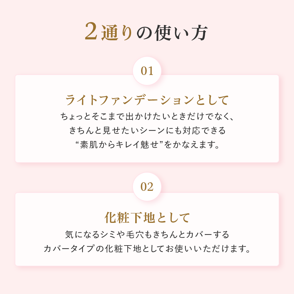 - 【ファンデーションとしても化粧下地としても】スキンケアのあとこれ1本。気になるシミや毛穴もきちんとカバーするカバータイプの化粧下地としても、ライトファンデーションとしても。"素肌からキレイ魅せ”、をかなえます。