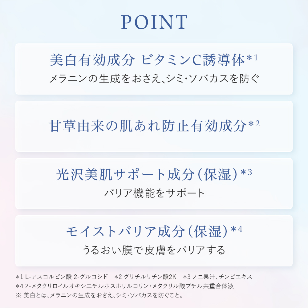 - 美白有効成分:ビタミンC誘導体(L-アスコルビン酸 2-グルコシド)