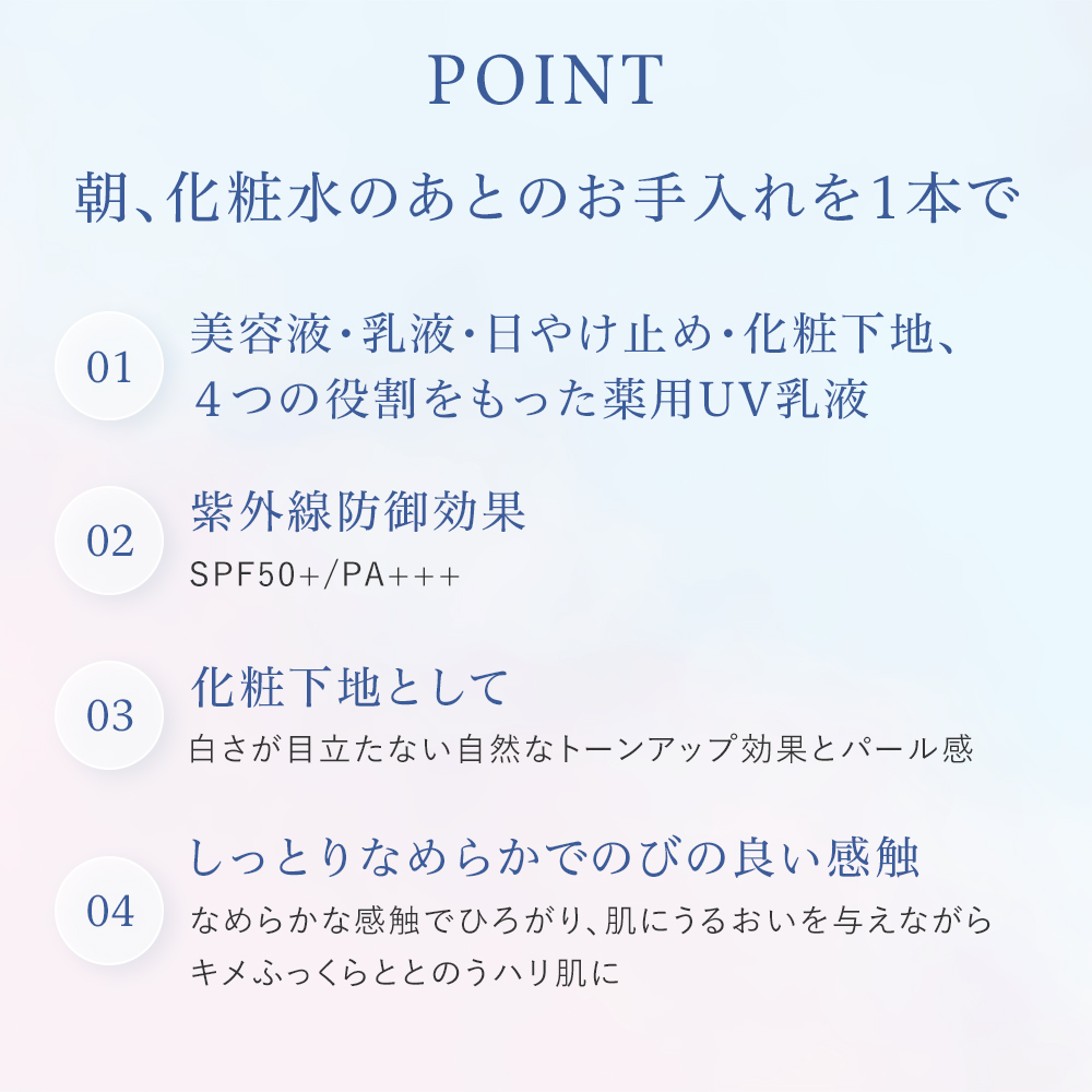 - 【1本で4つの機能の日中用乳液】美容液・乳液・日やけ止め・化粧下地の役割を備えた多機能UV乳液です。