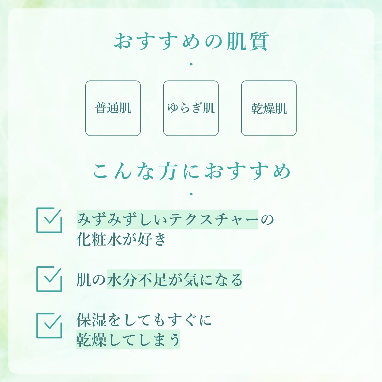 植物のめぐみがあふれる、みずみずしいうるおいが、乾燥ストレスでゆらぎがちな肌にもスッとなじみます。