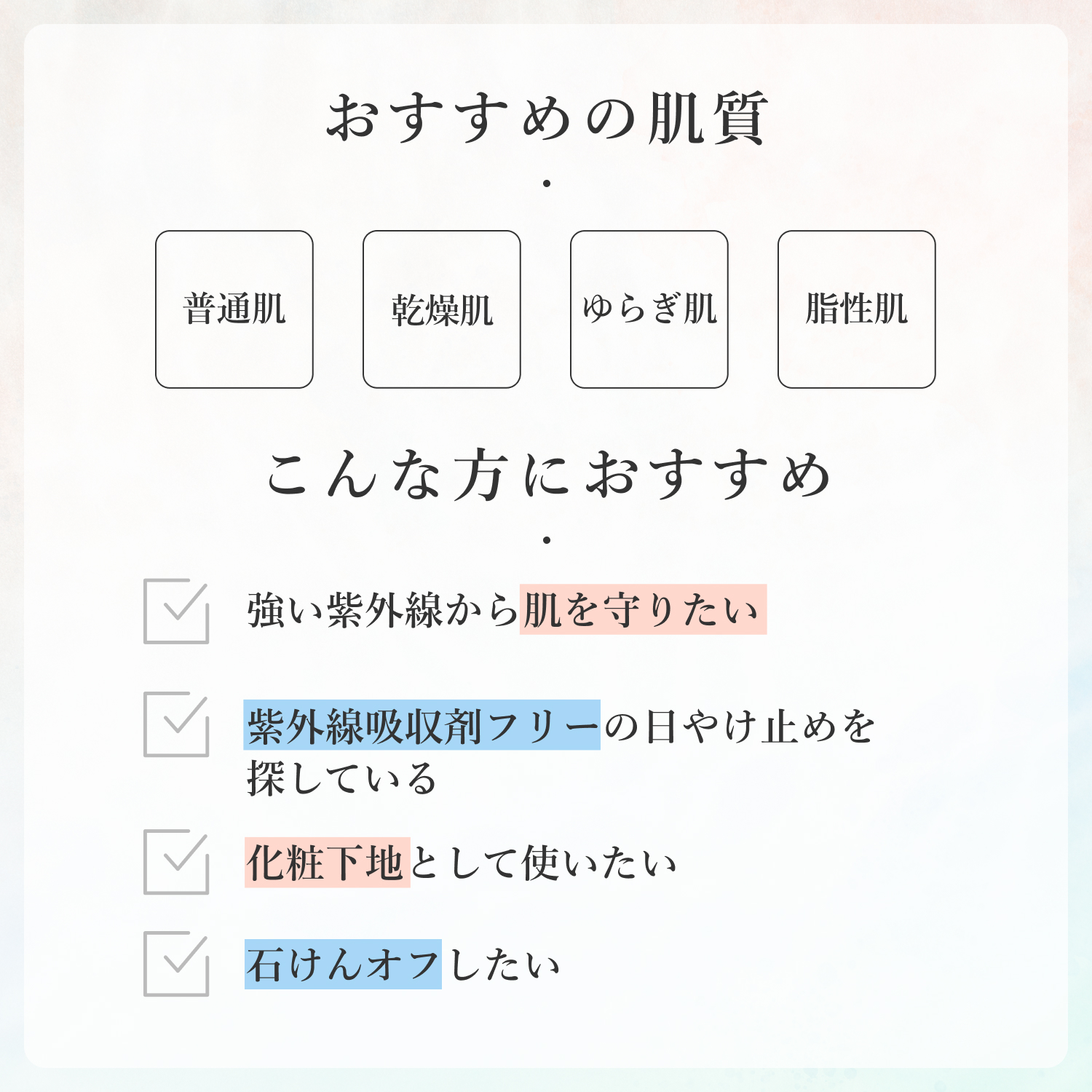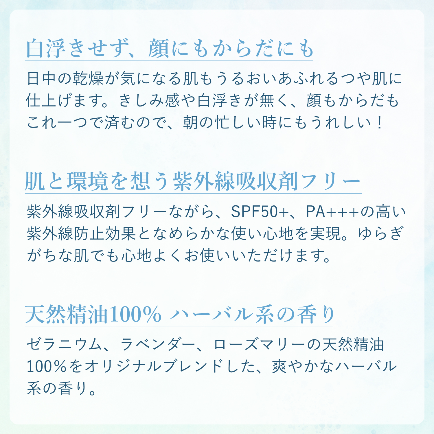 紫外線吸収剤フリーながら、SPF50+、PA+++の高い紫外線防止効果となめらかな使い心地を実現。ゆらぎがちな肌でも心地よくお使いいただけます。