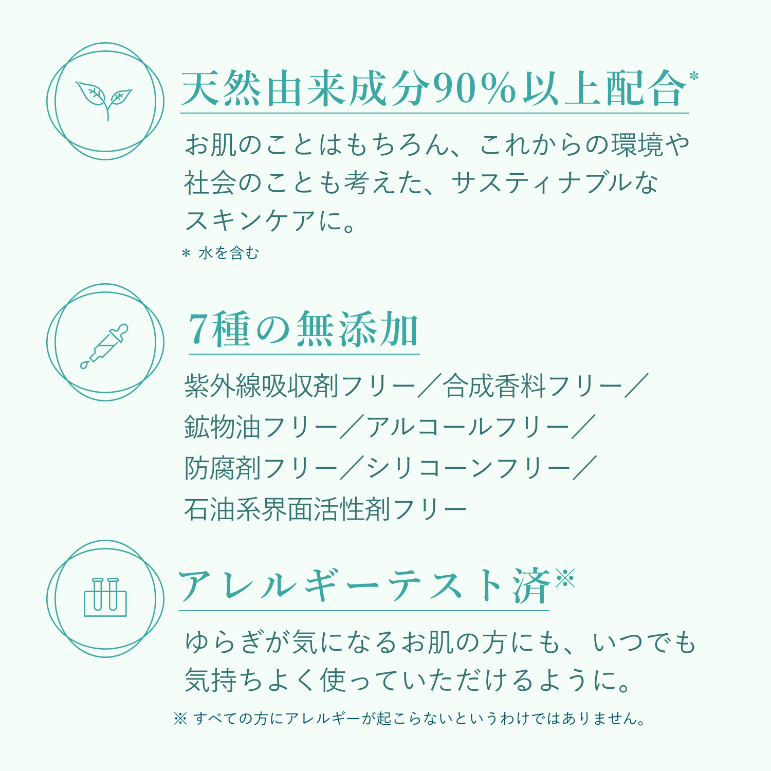 - 【天然由来成分90%以上配合*3のナチュラルコスメ】天然由来成分を90%以上も配合したナチュラル処方。お肌のことはもちろん、これからの環境や社会のことも考えた、サスティナブルなスキンケアを目指しました。
