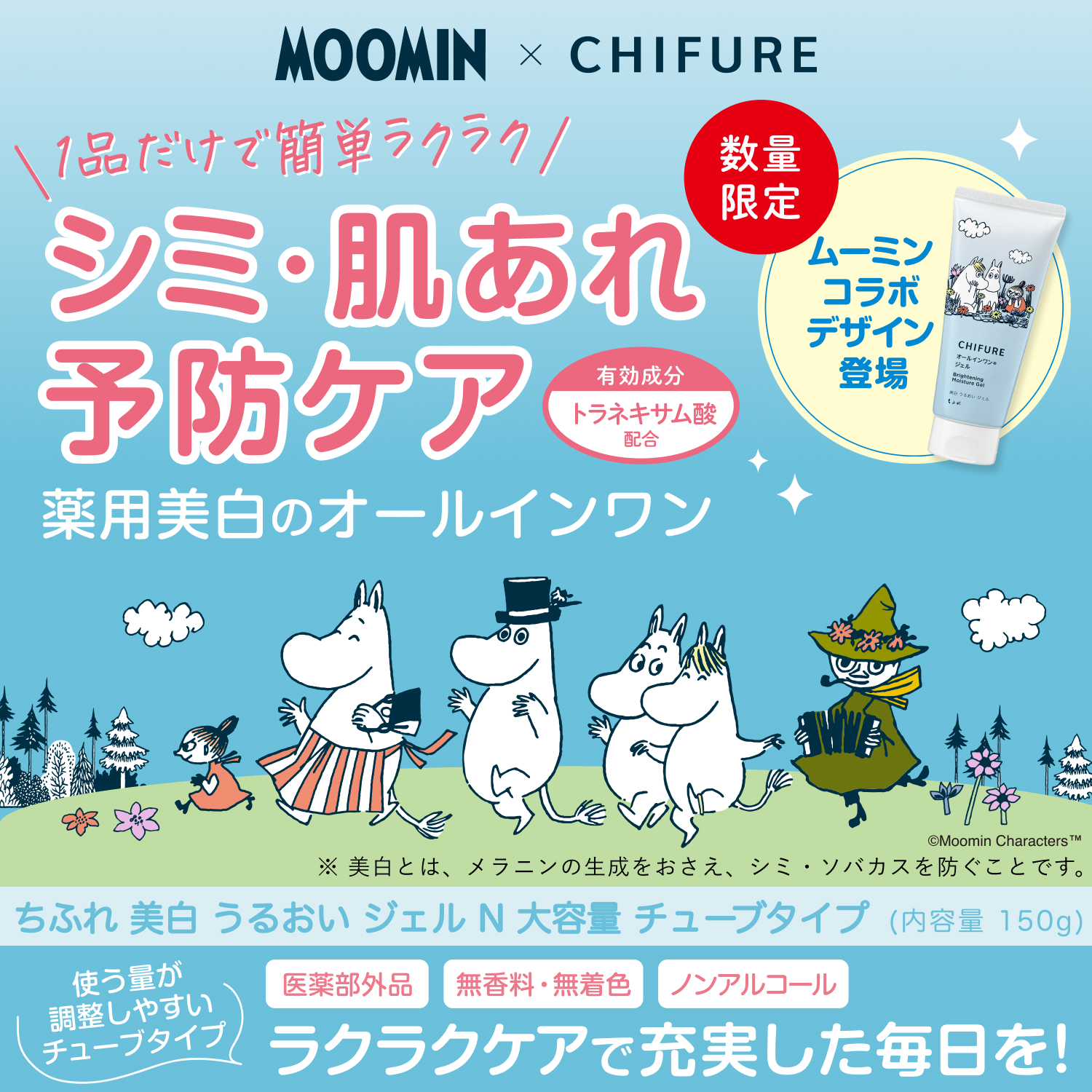 - 【ムーミンコラボ限定パッケージ】自分をいたわりながら、ムーミン谷に流れる自由で豊かな時間のようにスキンケアのひとときを大切にしてほしい、そんな願いからコラボレーションが実現した限定デザイン。忙しい現代人の肌と心に、ゆとりを届ける特別な1品です。
