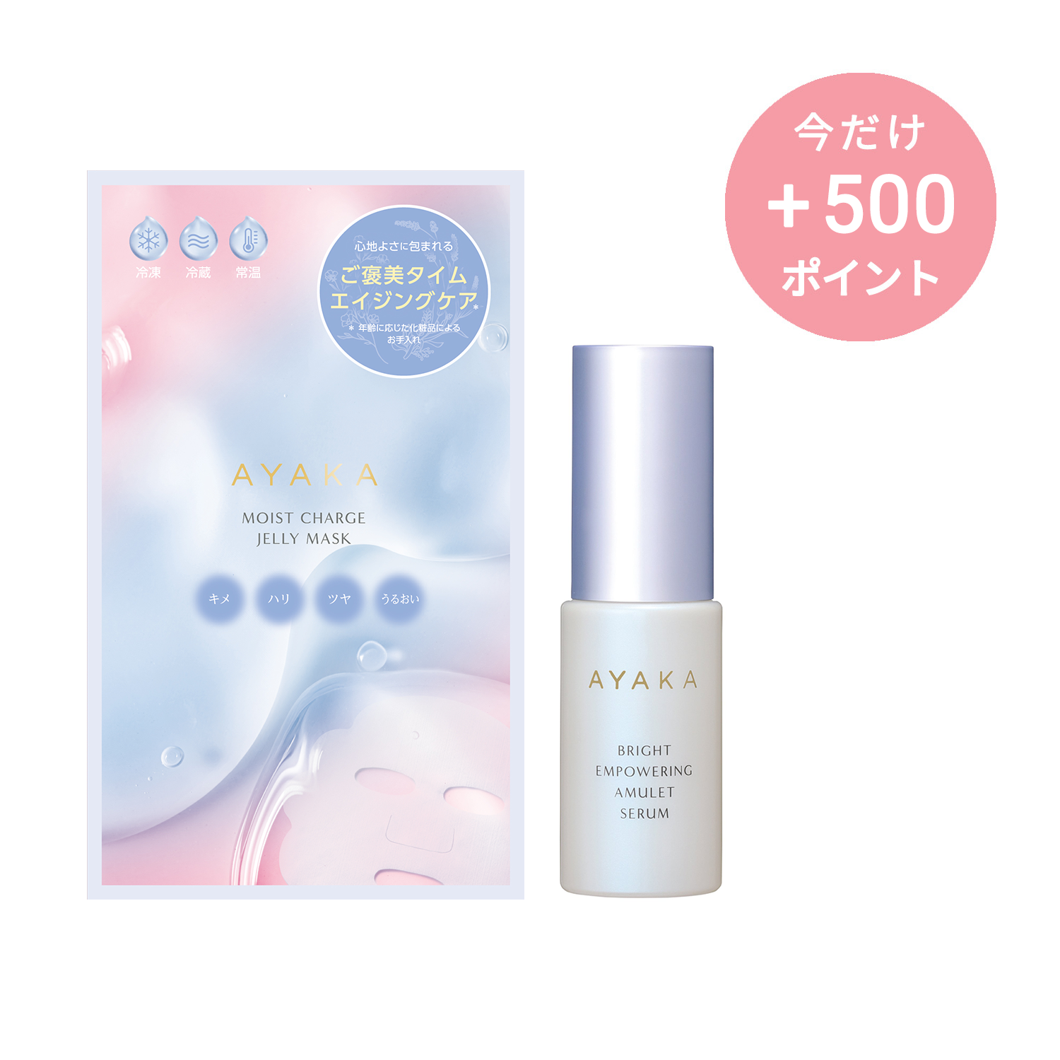 AYAKAブライトニングアミュレットシリーズの美容液と冷凍・冷蔵・常温の3WAYで使えるジュレマスクのスペシャルなセットです。毎日のスキンケアを贅沢で特別な時間に。