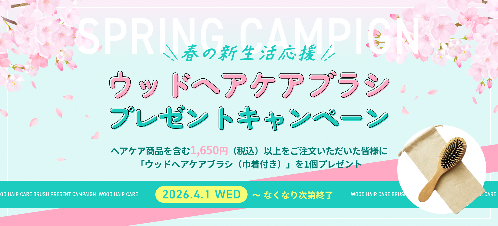 期間中、ヘアケア商品を含む1,650円(税込)以上をご注文いただいた皆様に「ウッドヘアケアブラシ(巾着付き)」を1個プレゼントいたします。